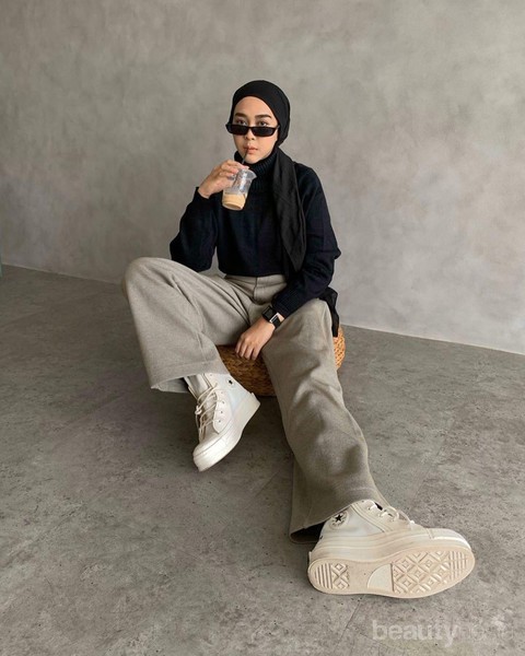Mengenakan basic outfit dalam warna netral, penampilan minimalis Intan Khasanah ini sangat pas digunakan untuk situasi kasual. Ia memadukan turtleneck sweater hitam dengan celana abu-abu dan sneakers putih, lalu menyempurnakan penampilannya dengan turban simpel yang memiliki sisi menjuntai di bagian samping.