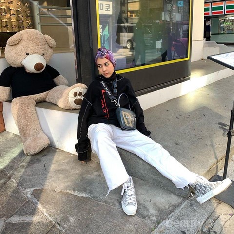 Salah satu gaya turban andalan Intan Khasanah adalah turban cepol yang simpel seperti dalam gaya yang satu ini. Saat tengah berlibur ke Korea, influencer cantik ini tampil boyish dengan hoodie hitam yang dipadukan bersama inner turtleneck, celana putih serta sneakers. Sebagai pengganti hijab, ia mengenakan turban bernuansa ungu yang ditata dalam gaya cepol depan.