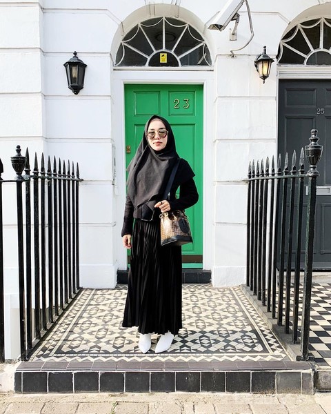 outfit serba hitam saat liburan ke London. Ia terlihat berfoto di depan sebuah bangunan yang terlihat seperti rumah. Penampilannya pun seakan kontras dengan