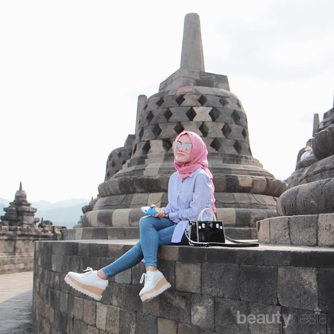 Selanjutnya ada gaya liburan Medina di dalam negeri. Kala itu, ia berkunjung ke candi Borobudur. Duduk santai sambil menyilangkan kaki nya, Medina terlihat begitu menawan. Tampilannya yang