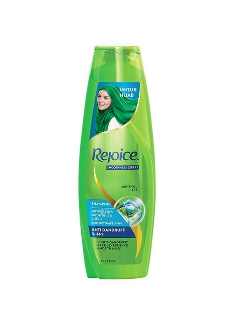 Rejoice menghadirkan shampoo dengan inovasi yang dilengkapi tiga menfaat yaitu melawan ketombe, melembutkan rambut, dan menghilangkan rasa gatal di kulit kepala. Selain itu shampoo ini dilengkapi dengan serum, creambath essence, dan kandungan mentol sehingga sangat efektif untuk menutrisi dan menghaluskan rambut. Untuk isi 170 ml Rejoice Shampoo Anti Dandruff 3 in 1 untuk Hijab ini dibandrol dengan harga sekitar Rp. 20.000.