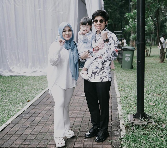 Sementara sang istri, Aurel mengenakan kemeja putih dan celana panjang berwarna senada lengkap dengan hijab berwarna biru muda.Â