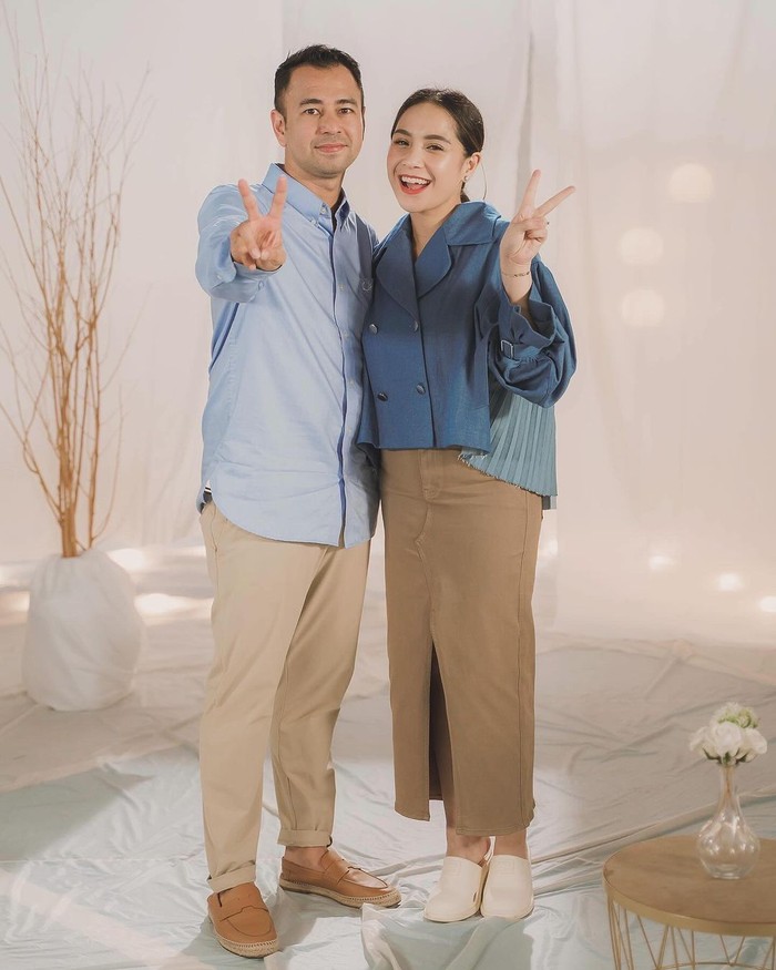 Pada momen tersebut, keduanya memilih tampil santai. Kemeja putih dan celana panjang coklat menjadi pilihan Raffi. Sementara Nagita Slavina memilih mengenakan hoodie crop berwarna navy dipadukan rok coklat panjang.