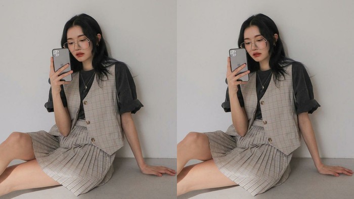 Kaos berwarna netral seperti hitam atau putih cocok banget dipadukan dengan vest. Lalu untuk bawahan, pilih rok dengan cutting pleated. Kamu juga bisa memilih satu set vest dan mini skirt dengan motif plaid seperti potret di atas. So stylish!