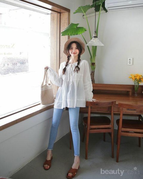Foto: IstimewaBlouse enggak hanya untuk acara formal aja, loh! Kamu juga bisa menggunakan white blouse untuk berlibur, pilih blouse dengan cutting longgar dan bahan yang ringan, Ladies. Kamu bisa melengkapi penampilan kamu dengan topi jerami atau fedora hat.