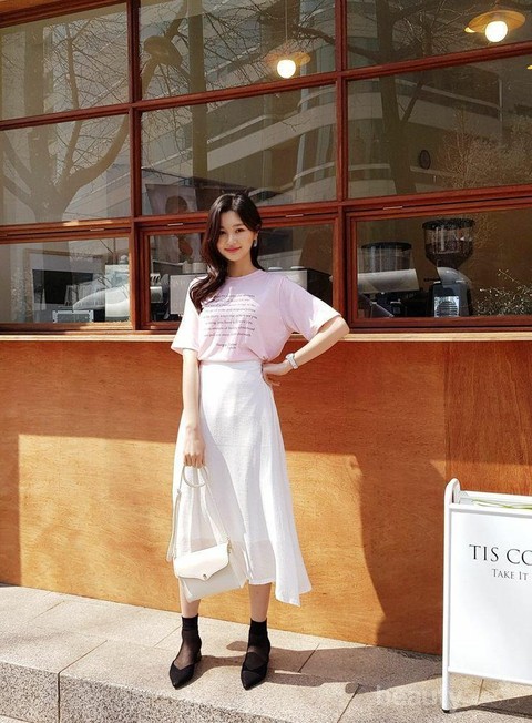 Foto: IstimewaJika kamu suka tampil santai dengan t-shirt, kamu bisa menggunakan t-shirt yang dipadukan dengan midi skirt agar penampilan kamu tetap feminin namun tetap nyaman dan simple, Ladies.