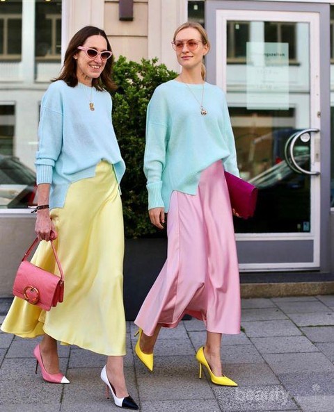 Mau tampil dengan gaya nyentrik tapi modis bak model? Bisa banget kamu tiru, cobain deh memadukan atasan sweater warna biru pastel dengan rok satin warna-warna terang. Biar makin kelihatan elegan dan berkelas, bisa menggunakan sepatu model stiletto, hand bag, dan tambahan accessories lain seperti kalung emas dan kaca mata riben Ladies.