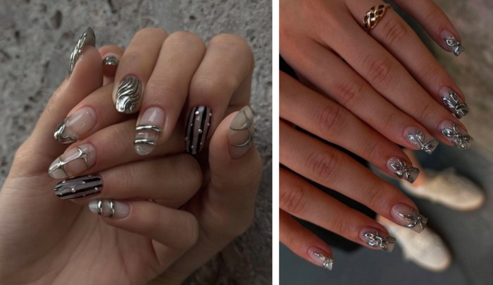 Chrome dan metallic pattern nails menghadirkan nail art futuristik dengan efek kilau yang eye-catching dan cocok untuk statement manicure/Foto: pinterest.com/tajaisabou/justragithings0311
