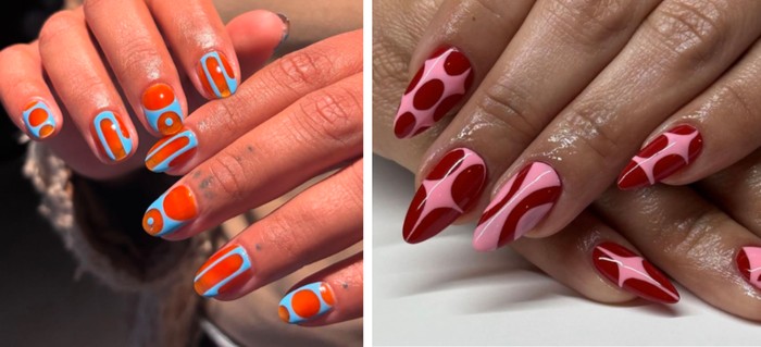 Groovy abstract nails dengan motif retro dan warna kontras jadi tren patterned manicure yang artsy, fun, dan penuh karakter/Foto: pinterest.com/bijeej/marigabarashvili69