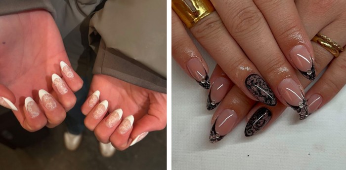Lace French tip nails menawarkan desain manicure elegan dengan motif renda halus. Cocok untuk tampilan kuku feminin dan classy/Foto: pinterest.com/miloualbers/fashionnmodel