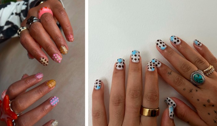 Polka dot nails jadi pilihan patterned manicure paling playful. Desain kuku motif bintik ini cocok untuk look cute, retro, dan mudah dipadukan/Foto: pinterest.com/leminimacaron