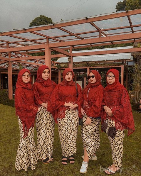 bridesmaids di atas. Warna merah cerah bisa kamu pasangkan dengan hijab berwarna senada. Untuk bawahan, tinggal gunakan rok kain motif selendang. Untuk model nya, bisa disesuaikan dengan