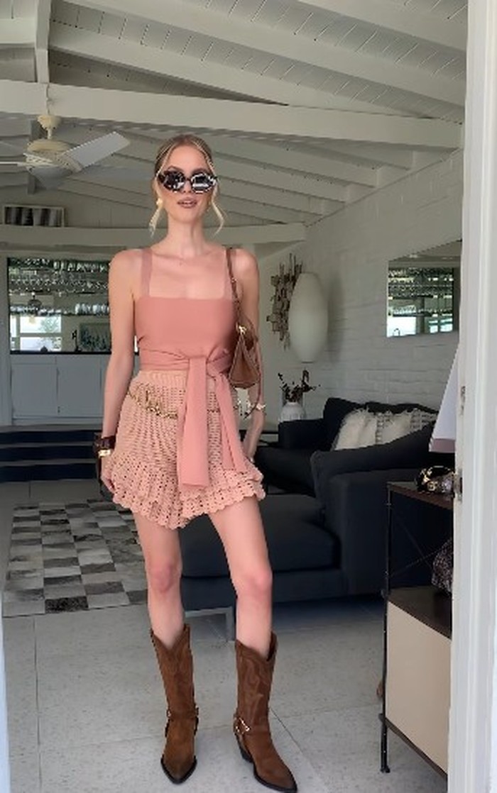 Leonie tampil cerah dengan atasan pink berdetail tali dan square-neck, dipasangkan dengan crochet shorts dan sabuk emas dari Chloé. Sepatu boots cowboy coklat suede menambah kesan Western yang chic. Gaya ini memadukan elemen boho dan glam dengan sempurna. Leonie sukses menjadikan gurun sebagai runway feminin yang playful.