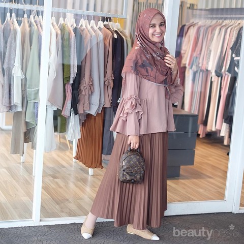 Kayaknya duo kakak beradik itu suka banget ya sama rok lipit. Sampai untuk tampilan formal aja mereka sukses tampil kece dengan outfit dan jilbab syar'i modis nya. Tinggal pakai heels dan tas yang cantik, deh.