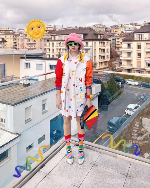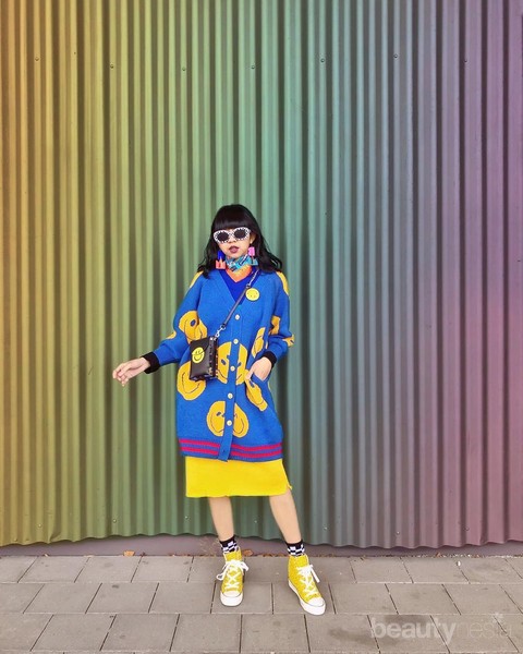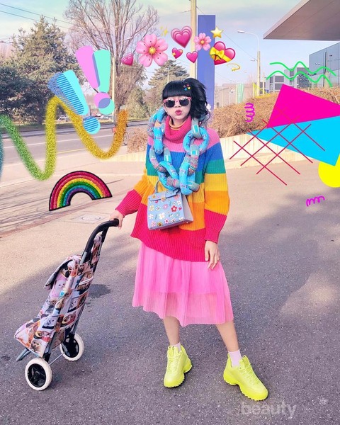 Sweater berwarna rainbow yang dipadukan dengan pink skirt, tas bermotif floral dan sepatu sneakers berwarna kuning membuat tampilannya menjadi lucu. Ditambah lagi aksesoris kalung besar yang berbentuk rantai menambah keunikan dari penampilannya. Super iconic!