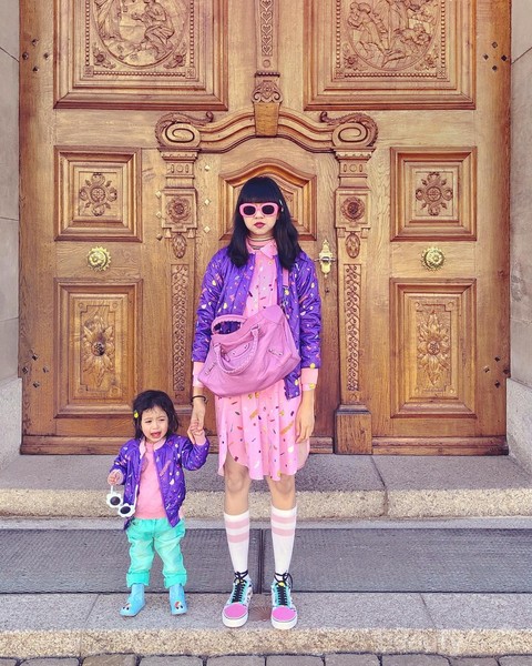 Look kali ini ia berfoto dengan buah hatinya dengan menggunakan salah satu koleksi dari brand-nya yaitu Schmileymo. Jaket berwarna ungu tua dengan motif warna warni dipadukan dengan dress berwarna pink dan tas senada. Meski look kali ini tidak banyak mencampurkan warna namun karakternya tetap kuat dengan penggunaan jaket dan dress bermotif tesebut.