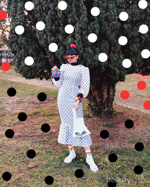 Penampilannya di outfit ini terasa lebih segar karena warna basic yang ia kenakan adalah dress berwarna putih dengan motif polkadot warna-warni. Untuk mempercantik style-nya ia padukan dengan jacket dengan motif yang hampir sama. Sedangkan warna-warna dari socks, tas, kacamata dan topinya seakan memperkuat warna-warni dari polkadot pada dress-nya.