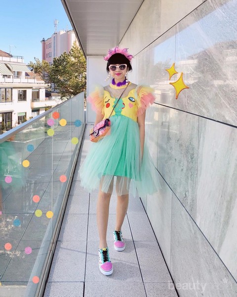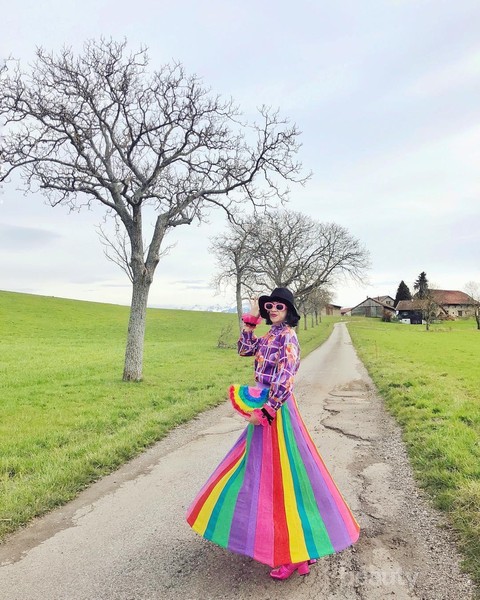 Rok berwarna-warni seperti pelangi menjadi pusat perhatian pada look kali ini. Untuk menambah kesan quirky, ia memadukannya dengan atasan warna ungu bermotif floral. Pouch rainbow yang ia kenakan juga menambah keindahan pada penampilannya.