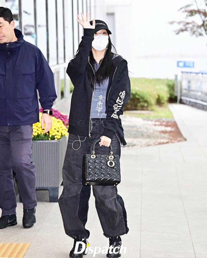 Jika kamu ingin tampil boyish, outfit airport Jisoo bisa menjadi inspirasi. Ia memadukan shirt bergaris dengan jaket hoodie hitam, serta celana baggy jeans yang longgar. Kamu bisa menambahkan tas Lady DIOR seperti Jisoo sebagai item yang menambah kesan elegan dalam tampilanmu.
