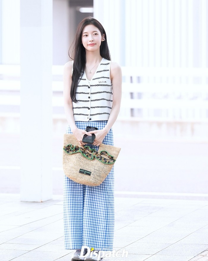 Ia mengenakan rompi rajut tanpa lengan berwarna putih dengan garis-garis hitam, dipadukan dengan celana panjang motif gingham biru-putih yang memberi kesan santai namun tetap manis.
