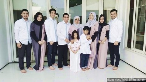 Zaskia Sungkar bersama keluarga begitu kompak berseragam di lebaran. Para wanitanya tampak senada dengan balutan kaftan berwarna ungu yang diberikan aksen payet di bagian dada sebelah kiri untuk lebih mempercantik. Pemilihan warnanya pun menarik, permainan warna antara ungu tua dan ungu muda yang dipadukan dengan sedikit warna hitam, super elegant!