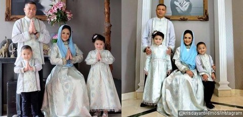 Keluarga kecil Krisdayanti tampil kompak dengan busana lebaran berwarna silver. Krisdayanti mengenakan dress A line dan terdapat sedikit cape di bagian lengan. Ia melengkapi tampilannya dengan penutup kepala berwarna biru muda, tampak anggun sekali.