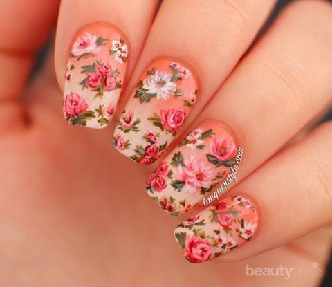 Inilah inspirasi nail art cantik yang keenam. Gradasi warna orange dengan desain bertabur bunga, membuatnya terlihat manis, cantik dan segar.