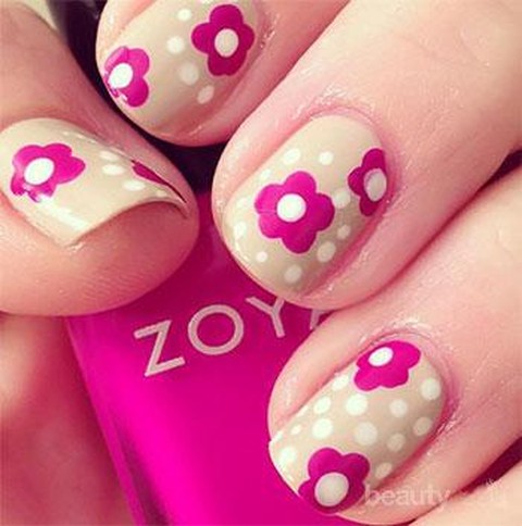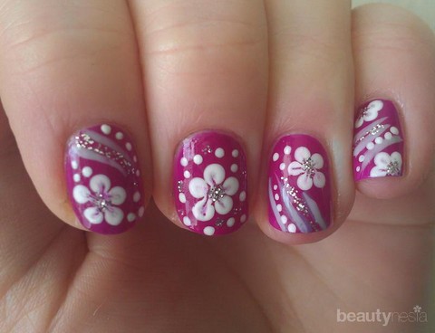 Pertama, nail art warna pink tua bergliter ditambah dengan dekoratif bunga berwarna pink muda. Ya, gradasi warna yang terkesan manis, segar dan mengagumkan.