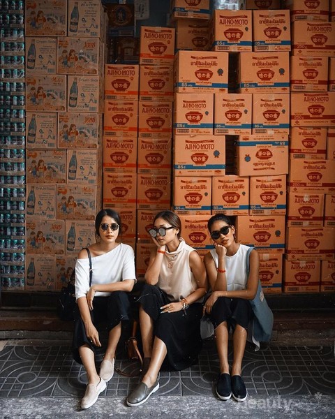 Siapa bilang gudang itu berantakan dan nggak enak difoto? Buktinya, Ayla Dimitri dan kedua sahabatnya bisa banget, nih, berfoto di depan gudang penyimpanan barang supermarket. Meskipun kelihatan kardus apa saja yang jadi background foto ini, tapi hasilnya tetap nice, kan?