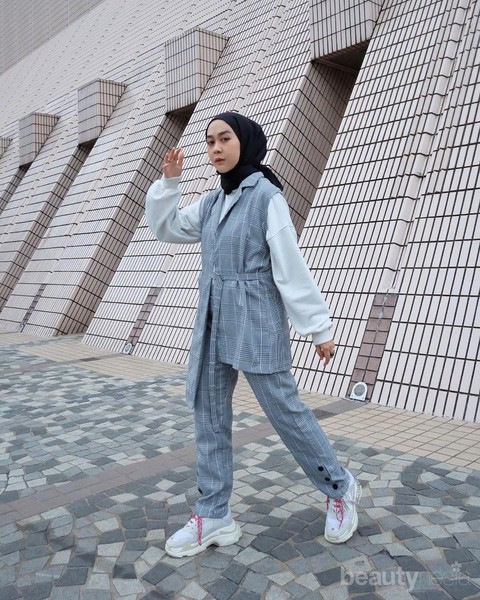 Buat kamu yang lagi cari referensi set busana kasual, OOTD Intan Khasanah bisa kamu sontek. Ia tampil cantik dalam balutan satu set busana kasual berwarna biru muda dengan model rompi bermotif garis-garis tipis. Untuk dalaman, Intan memadukannya dengan hoodie polos berwarna putih. Sneakers abu-abu dipilihnya untuk mempermanis penampilan.