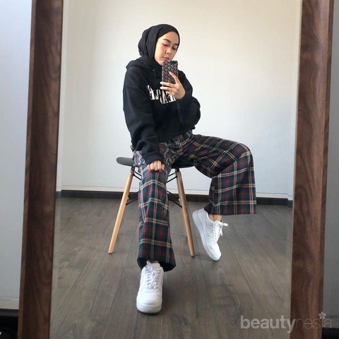 Buat yang nggak ingin ribet dan tampil simplehoodie jadi jawaban yang pas buat kamu. Seperti OOTD yang dikenakan oleh Intan Khasanah ini. Ia tampil swag dalam balutan hoodie berwarna hitam yang dipadukan dengan hijab warna senada. Intan Khasanah pun memilih bawahan berupa kulot motif kotak-kotak berwarna gelap. Sneakers putih jadi andalan agar penampilannya makin kece.