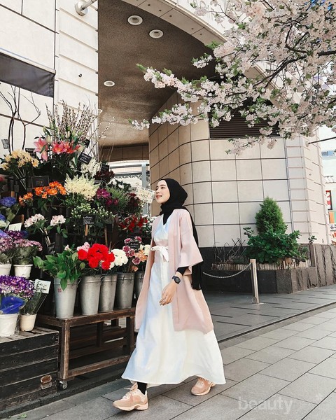 Nah, kalau kamu lebih percaya diri dan nyaman pakai rok, berarti OOTD Rizky Amelia ini wajib kamu coba. Ia tampil manis dan anggun dalam balutan long dress model pakaian kimono Jepang berwarna putih yang berpadu dengan outer warna merah muda. Hijab hitam pun dipilihnya yang disenadakan dengan manset dan juga legging. Sepatu sneakers berwarna merah muda pun dipilih agar lebih match dengan outfit yang dikenakannya.