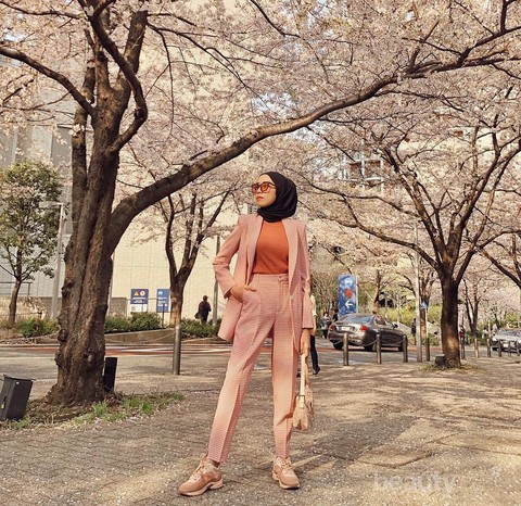 Nah, kalau kamu pengin tampil lebih formal dalam balutan set busana, OOTD Rizky Amelia yang satu ini patut untuk dicoba. Ia tampil manis dalam balutan set busana formal berwarna dusty pink dengan motif garis-garis tipis. Rizky Amelia pun memilih kaUs polos berwarna oranye sebagai dalamannya. Hijab warna hitam jadi pilihan Rizky untuk dipadukan dengan outfit-nya kali ini. Agar tampilannya makin kece, ia pun mengenakan sneakers berwarna nude.