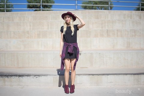t-shirt dress kamu kemudian ditambahkan dengan kemeja flanel yang diikatkan pada bagian pingganmu. Untuk penampilan yang lebih