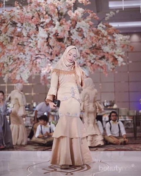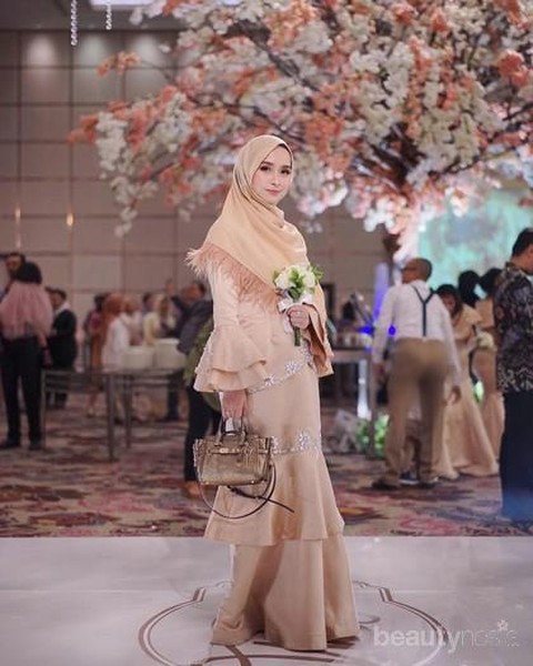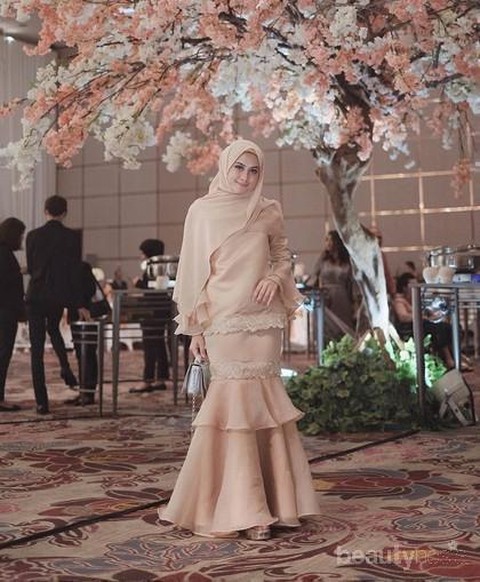 Foto: https://www.instagram.com/aghniapunjabi/Terakhir, Aghnia Punjabi tampil sedikit lebih berbeda dengan rok mermaid dan lengan lonceng yang berlapis. Lapisan ini membuat detail pada gaun Aghnia terlihat lebih indah dan anggun. Ia pun memadukannya dengan hijab yang dilengkapi headpiece seperti Nisa.