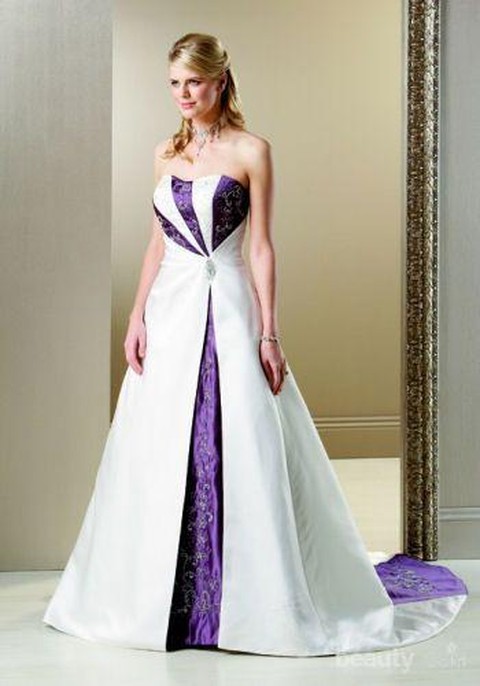 Gaun satu ini memiliki sentuhan warna yang berbeda juga, nih! Gaun pengantin berwarna putih dengan sedikit hiasan dan sentuhan berwarna ungu ini bisa juga menjadi alternatif apabila kamu merasa warna ungu terlihat terlalu mencolok.