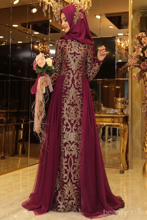Tidak hanya gaun pengantin biasa, warna ungu juga cantik digunakan sebagai warna gaun pengantin dengan hijab. Misalnya seperti ini, perpaduan corak berwarna keemasan dengan warna ungu terlihat cantik dan anggun.