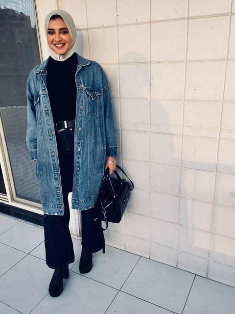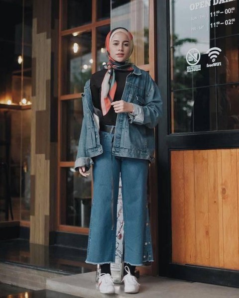 Buat kamu yang sedang mengikuti trend hijab fashion modern pasti tahu oversized denim jacket kan? Pasti kamu tergoda untuk memiliki fashion item yang satu ini. Nah, jika kamu sudah memiliki fashion item ini kamu bisa memakainya dengan celana denim pula. Tambahkan hijab bermotif untuk memberikan kesan elegan pada penampilanmu. Tambahkanlah belt hitam pada celanamu yang berwarna senada seperti kaos yaang kamu pakai.Yakinlah, kalau penampilanmi bakal kece abis!