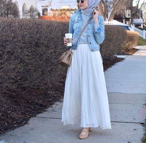 Fashion hijab modern saat ini sudah berkembang pesat. Denim jacket menjadi fashion item yang cocok dipakai untuk wanita berhijab. Denim jacket ini ternyata bisa dipadukan dengan rok lho ladies! Buat kamu yang hobi memakai rok, kamu bisa memakai rok plisket putih yang dipadukan dengan denim jacket seperti ini. Kamu bisa memakai kaos lengan panjang pada bagian dalam. Tampilan anggunmu akan tetap fashionable bukan?