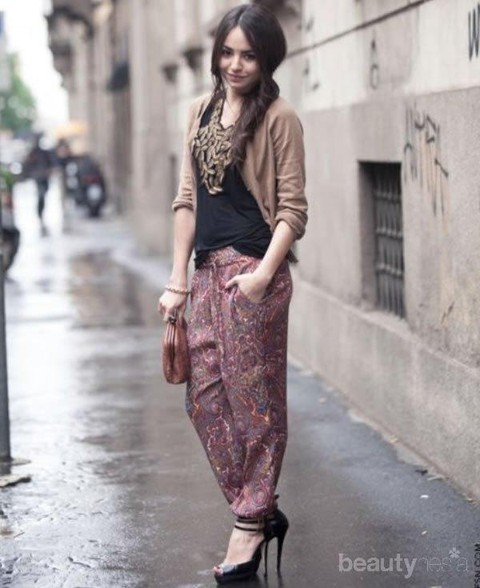 Buat kamu yang ingin tampil manis dan fashionable, kamu bisa coba untuk memadukan celana harem dengan tanktop hitam dan cardigan berwarna coklat. Tidak selamanya celana yang satu ini membuatmu terlihat terlalu kasual juga lho. Kamu bisa menggunakan high heels agar terlihat lebih rapi dan elegan. Pilihlah harem pants dengan warna yang senada dengan cardigan yang kamu gunakan. Jangan lupa menggunakan kalung sebagai aksesoris pelengkap juga ya.