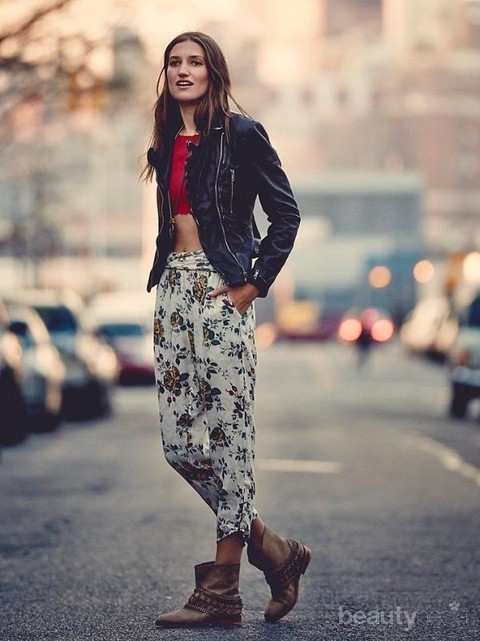 Ingin tampil lebih edgy dengan menggunakan celana bahan? Kamu bisa memadukan harem pants dengan jaket bomber. Sebagai dalaman, kamu bisa menggunakan crop top kesukaanmu. Untuk menyempurnakan gayamu, kamu bisa menggunakan ankle boots. Jangan lupa untuk memilih harem pants dengan motif ya agar penampilan kamu lebih edgy dan menarik.