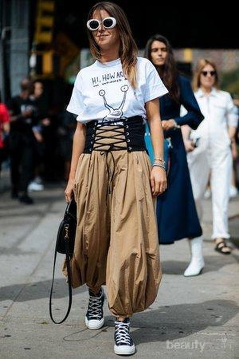 Buat kamu yang menyukai gaya yang cenderung kasual, kamu cukup memadukan harem pants dengan kaos saja. Masukkan kaosmu ke dalam celana dan gunakan korset di bagian luar pinggangmu agar terlihat lebih stylish. Untuk sepatu, kamu bisa menggunakan sepatu sneakers yang nyaman untuk kamu gunakan. Gaya seperti ini meskipun simpel tapi bisa membuatmu terlihat stylish banget lho. Mudah banget kan untuk memadukan celana bahan yang satu ini?