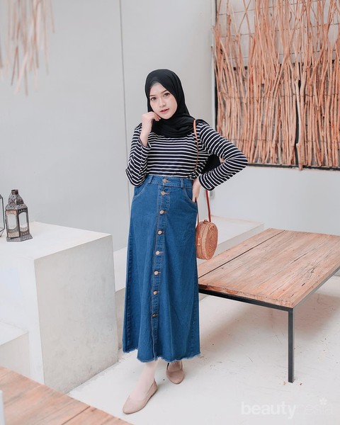 Ladies mau sekali-sekali menggunakan rok? Yuk tengok ootd hijab casual saritiw yang lucu sekaligus casual. Padukan rok jeans berwarna navy dengan long sleeve strip hitam dan tambakan pashmina hitam yang dibentuk sederhana. Ladies juga bisa menggunakan long sleeve warna monokrom lainnya agar tidak menghilangkan kesan monokrom dan casual yang ingin diciptakan.