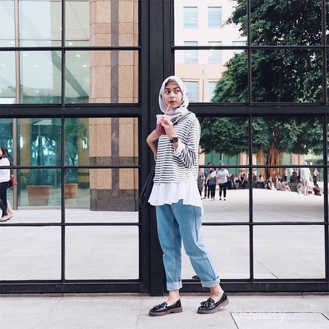 Foto: https://www.instagram.com/diantyy.a/Mau kelihatan lebih santai lagi? Mix boyfriend jeans dengan sebuah stripes top dengan desain flare pada bagian bawahnya. Jangan lupa hijab segiempat bermotif yang akan memberi warna pada casual hijab-mu. Tenang, gak akan tabrak warna, kok!