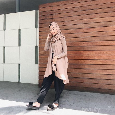 Para remaja biasanya memilih sebuah outfit yang terkesan formal dengan casual hijab. Gak masalah, karena formal look tidak berarti harus selalu memakai outfit formal. Untuk itu, kamu bisa contek style hijab Dianty Annisa yang satu ini. Pilih sebuah atasan lengan panjang, long sleveless cardigan, dan hijab pashmina dengan warna senada lalu padukan dengan celana hitam dan sebuah mule sandals. Mudah, kan?