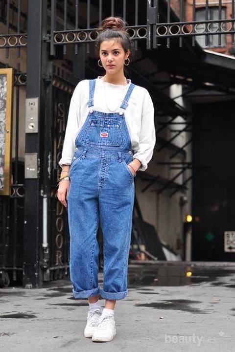 dungaree kamu berbahan denim, dalaman putih, dan