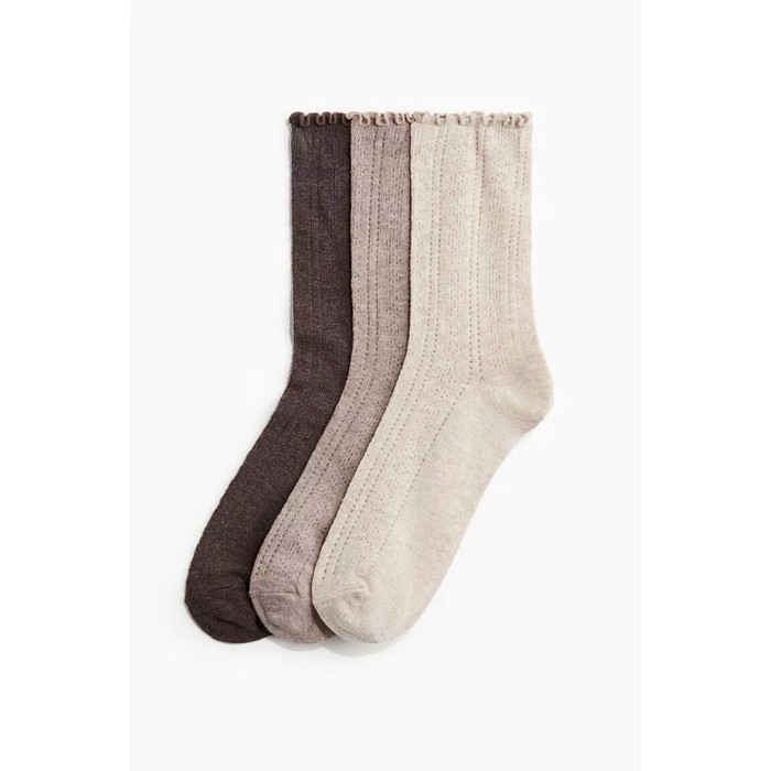Kaus kaki H&M ini hadir dengan rajutan pointelle lembut terbuat dari campuran katun, serta dilengkapi dengan bagian atas yang elastis dan dihiasi rumbai yang romantis. Dijual 1 set isi 3 dengan warna-warna bumi yang lembut.