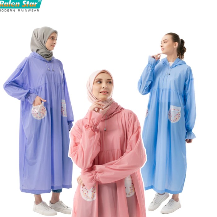 Masih dari brand lokal yang sama, jas hujan model gamis yang di desain dengan motif bunga di bagian bawah dan lengan. Menggunakan bahan polyester berkualitas tinggi sehingga tidak mudah sobek. Terdapat ritsleting di bagian kiri dan kanan serta lengan karet. Memiliki beragam warna pilihan cantik yang cocok digunakan untuk remaja sampai dewasa.