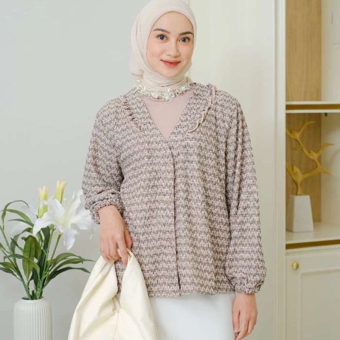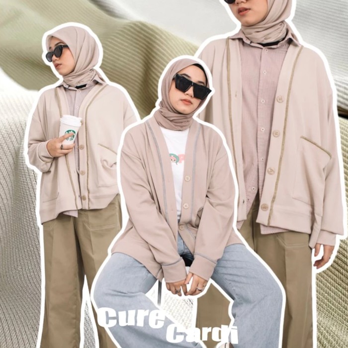 Kardigan ini menggunakan bahan tweed knit yang tebal dan tidak menerawang. Cocok dipadukan dengan celana jeans atau bahan. Bagi kamu yang berhijab, warna-warna hijab nude sangat pas ketika memakai kardigan dengan warna netral ini.