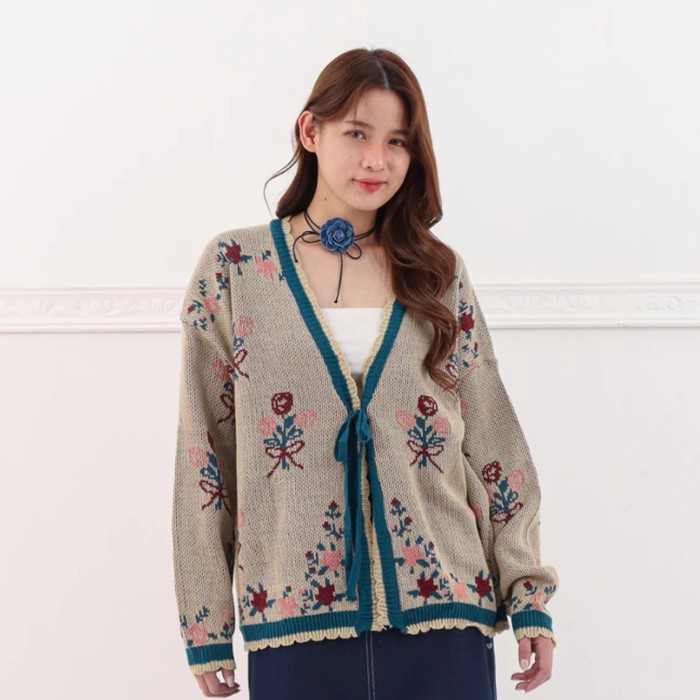 Perpaduan warna cokelat dan warna biru serta motif bunga yang bikin makin lucu. Kamu bisa padukan dengan celana atau rok dengan warna-warna netral lainnya, seperti hitam, putih, atau coklat. Terdapat detail tali pita yang menambah cardigan ini semakin cute!